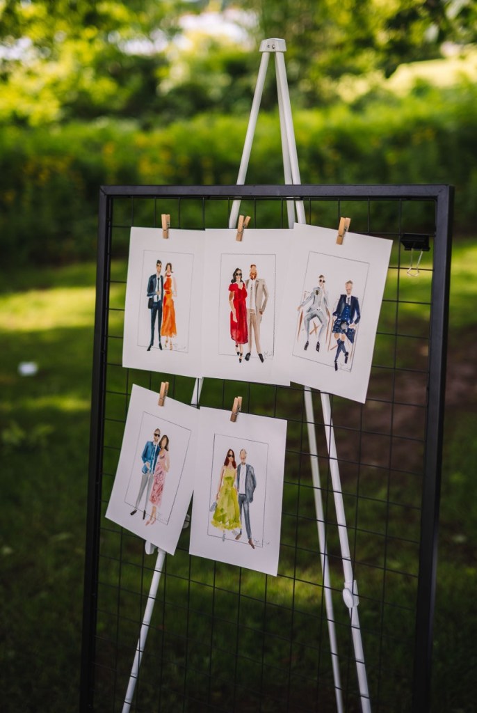 As a live wedding illustrator, my task was to capture the guests through spontaneous, on-the-spot live sketches. Positioned on the lawn under a tree, I set up my easel and began mingling and takin photos of guests to work from. Each portrait was created unique to each guest. A little keepsake to treasure.