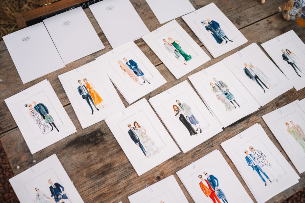 What makes live wedding illustration so special is the ability to capture the emotions of the moment. There’s a certain fun in creating art in real-time, surrounded by the love and energy of the friends of the couple. For Helena and Jesse, these sketches served as personal mementos of their special day, each one telling a story of beautiful outfits and a memory made.