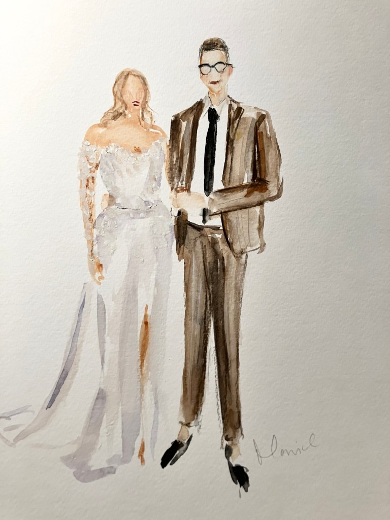 As a destination wedding artist, my task for the day was guest portraits on watercolour paper. I aimed to capture the colourful summer dresses, joy and laughter shared by the wedding guests. Each portrait captured the essence of the person I painted, as they reveled in the joyous celebration of Lucie and Jamie’s day.