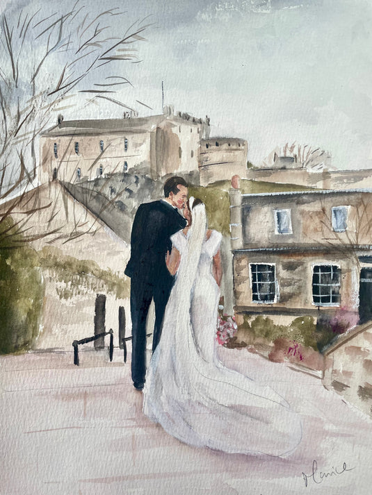 I attend the wedding to paint a live scene of the day, or I may paint your wedding portrait from photos after the wedding.